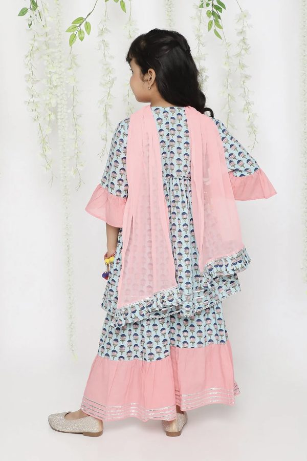 Brighten up festive celebrations with this adorable ethnic wear set for girls. Featuring a vibrant printed kurta with playful detailing, flared sharara pants, and a contrast dupatta, this ensemble is perfect for weddings, parties, and traditional occasions.
