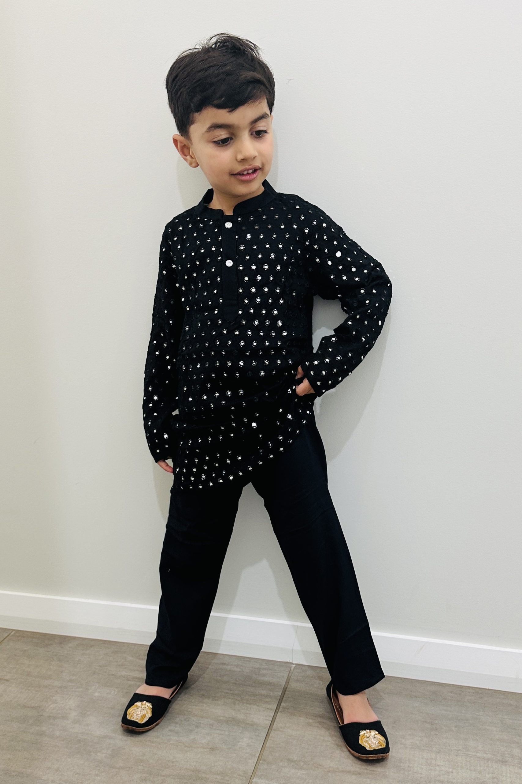 Add a royal touch to your little one’s festive wardrobe with this elegant Silk Kurta, Pyjama & Embroidered Jacket Set. The solid silk kurta and pyjama offer timeless grace, while the intricately embroidered jacket brings sophistication and charm—perfect for weddings, festive occasions, and cultural celebrations.